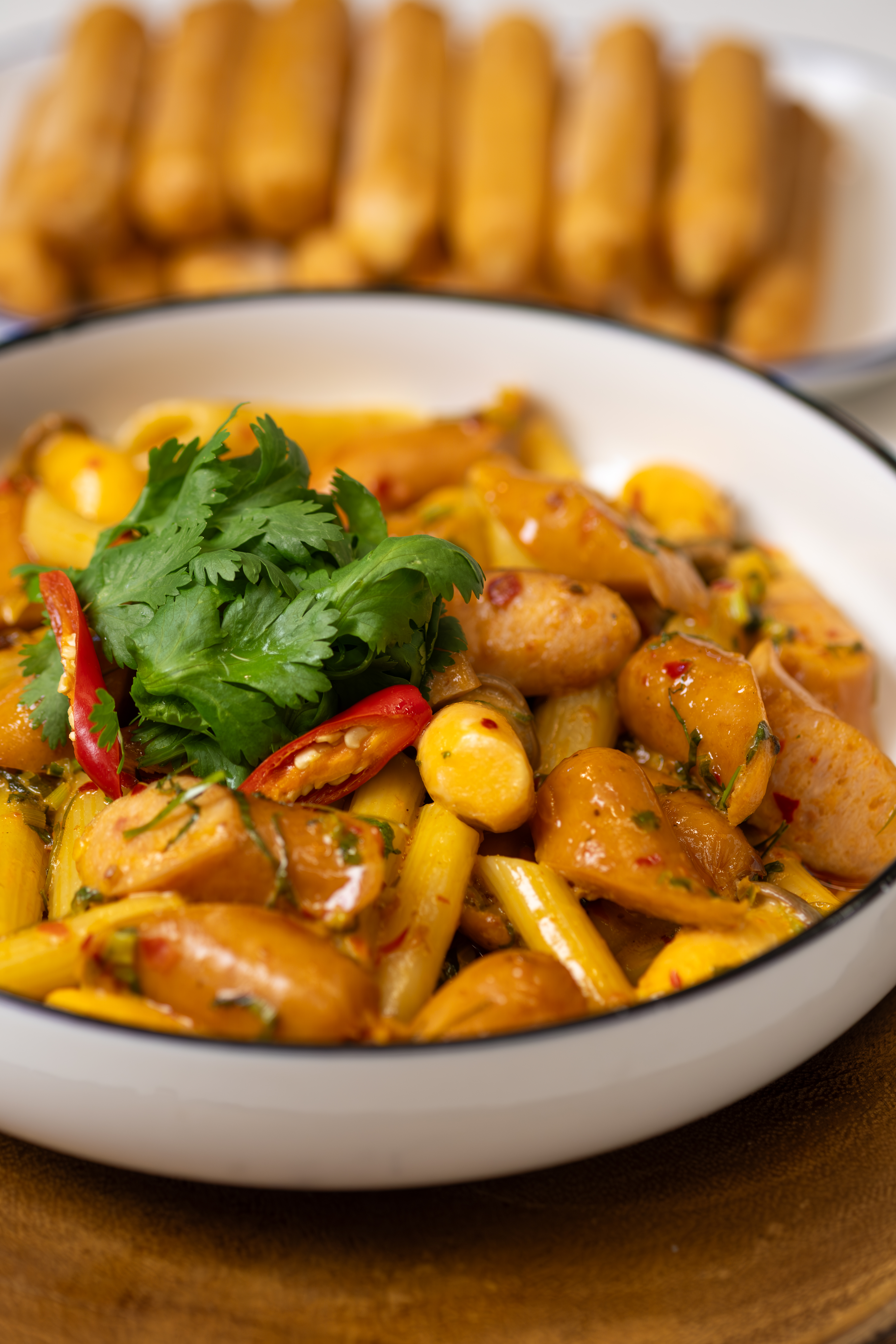📌 วัตถุดิบ น้ำมันพืช 30 กรัม พริกขี้หนูจินดาแดงซอย 3 เม็ด น้ำพริกเผาต้มยำ 60 กรัม ไส้กรอกอาราบิกิต้มยำ หั่นท่อน 80 กรัม เห็ดฟาง 50 กรัม น้ำเปล่า (น้ำต้มเส้นพาสต้า) 60 กรัม คุกกิ้งครีม 80 กรัม น้ำมะนาว 20 กรัม น้ำตาลทราย 1 ช้อนชา น้ำปลา 2 ช้อนชา ผักชีซอยฝอย 5 กรัม ผักชีใบเลื่อยซอยฝอย 3 กรัม ใบมะกรูดซอยฝอย 1 กรัม ใบผักชี สำหรับตกแต่ง พริกขี้หนูสวน สำหรับตกแต่ง